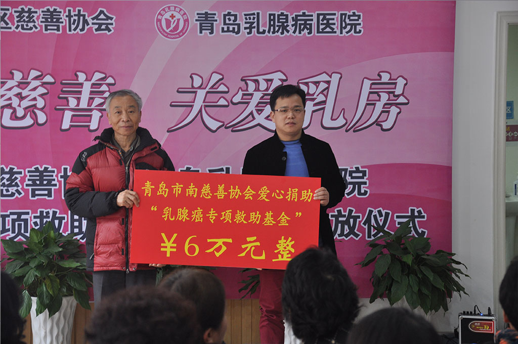 青岛乳腺病医院携手市南慈善协会举办“携手慈善·关爱乳房——乳腺癌专项救助基金捐赠暨发放仪式”,向乳癌患者伸出援手,为“乳腺癌专项救助基金”捐助善款6万元。